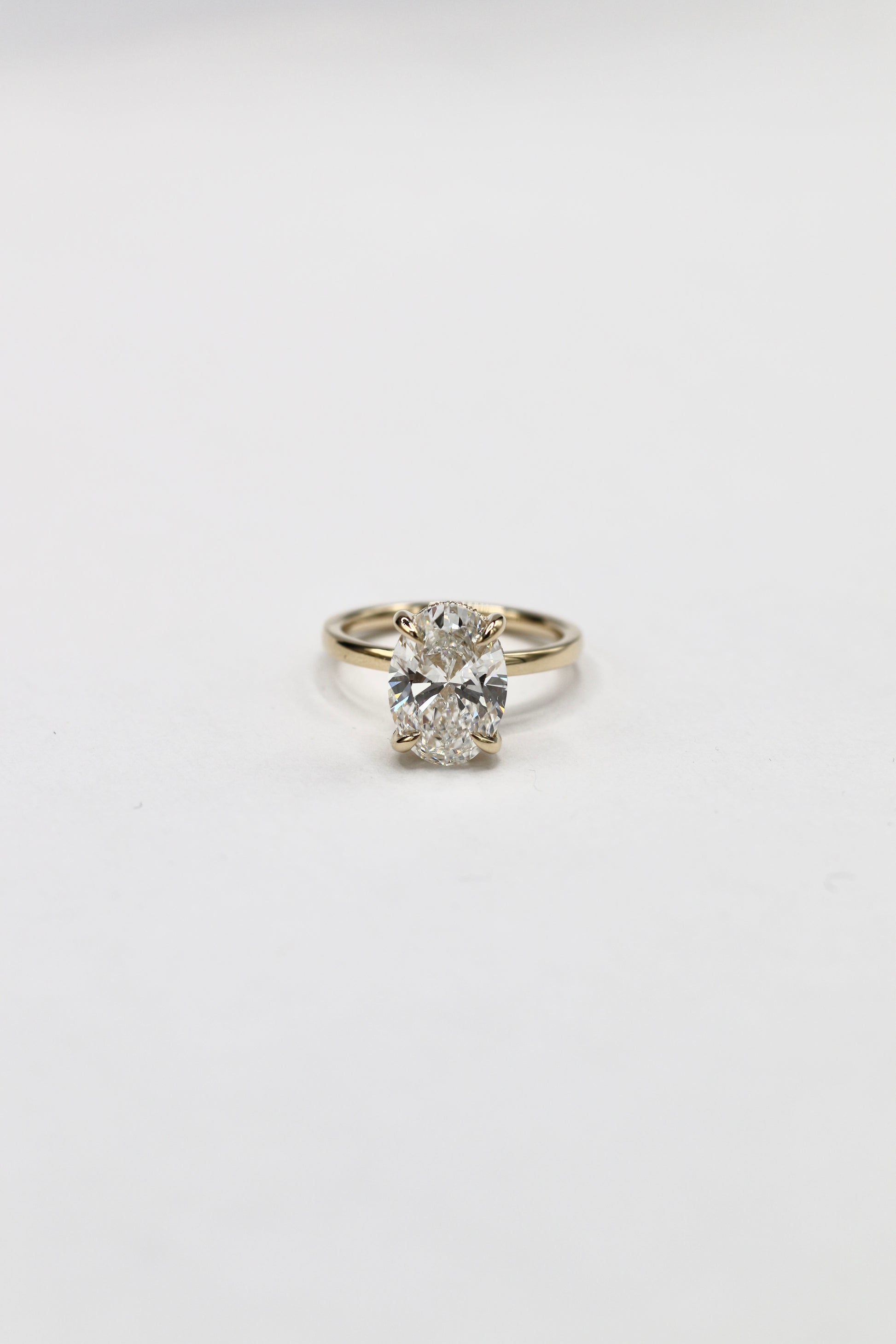 A stunning 4 carat brilliant cut Oval Diamond (lab grown) set in 14k yellow gold. Features a hidden halo.
