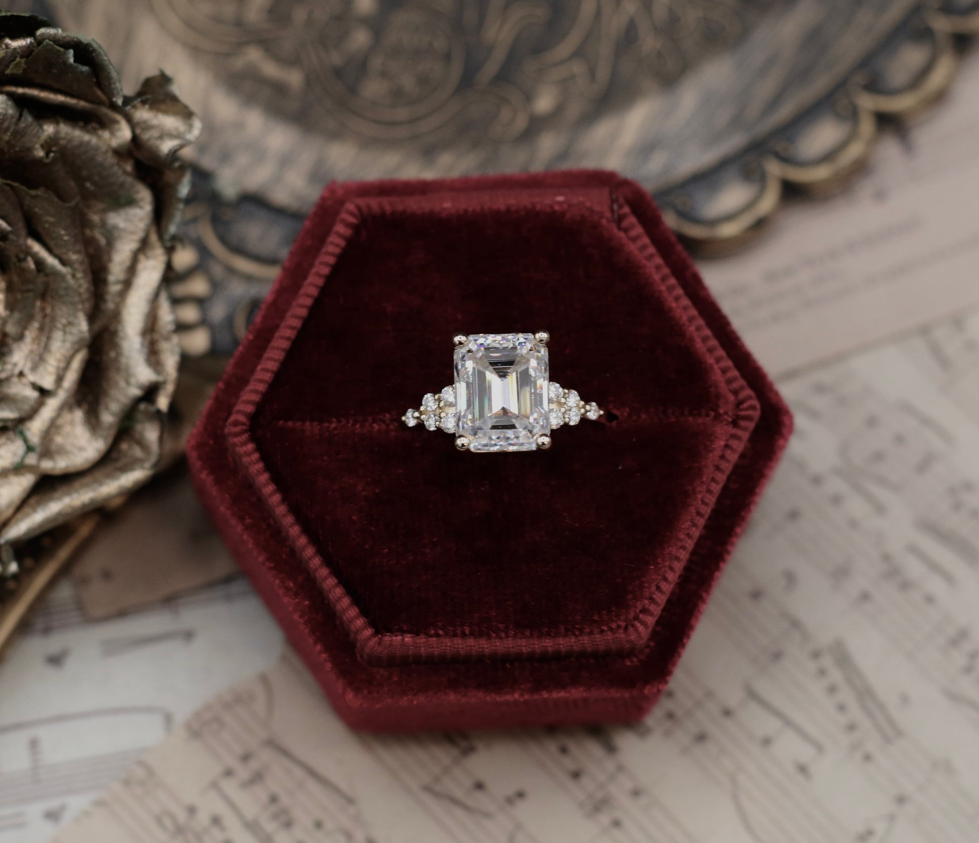 Stunning 14k Solid yellow gold ring, featuring a 4ct Emerald Cut Moissanite center stone.
